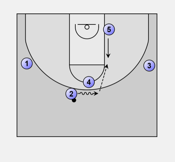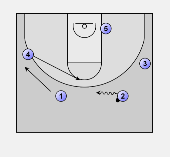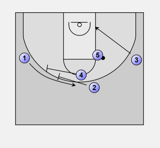 When 2 passes to 5, he and 4 move to set a staggered screen for 1.