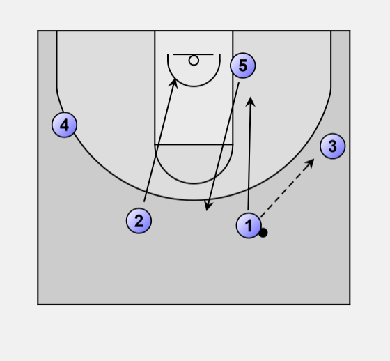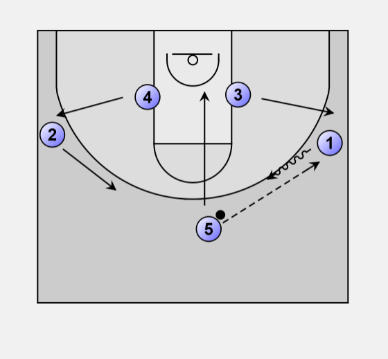 If 5 doesn't get the backdoor pass, the players are back in their original positions, and 1 can wave 2 through to begin "high", pass to the wing and cut through to begin "low" , or run another play.