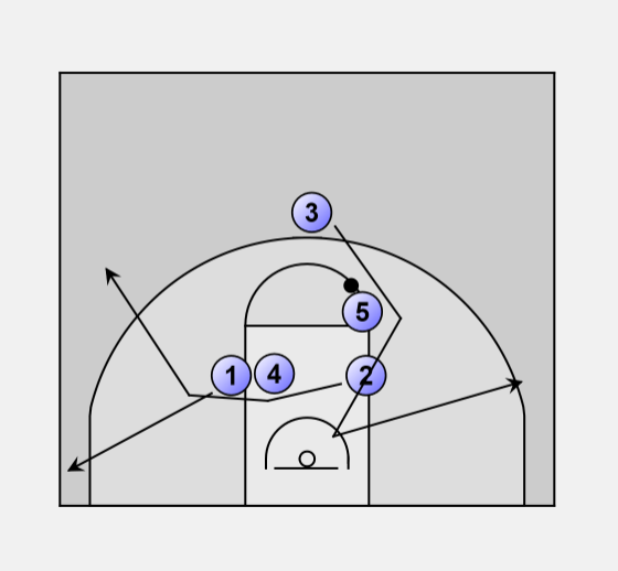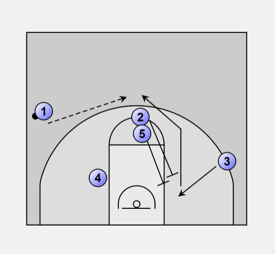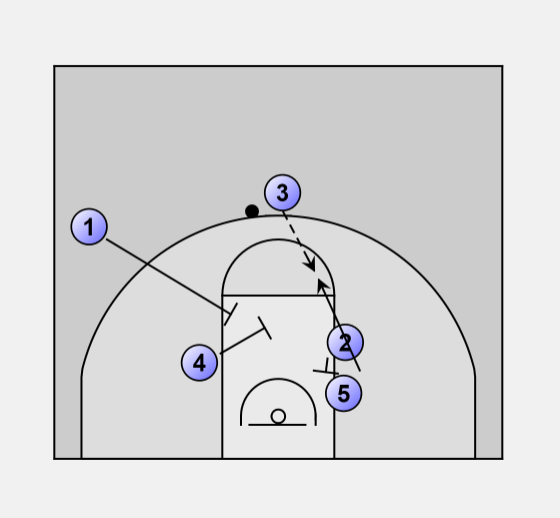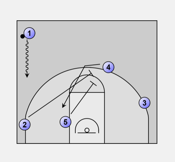 2 and 5 set a diagonal staggered/double screen for 4 from the ball side wing.