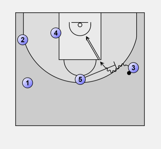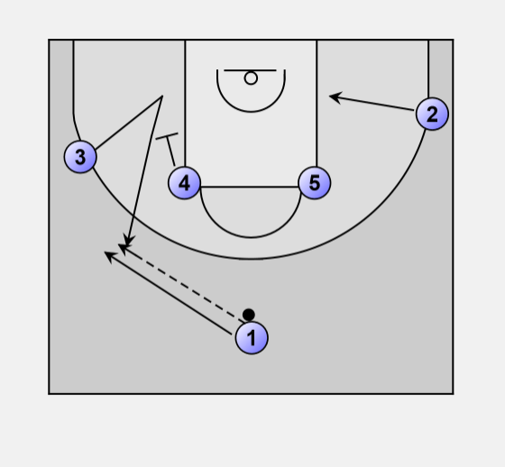3 fakes down and uses the screen of 4 to receive the ball from 1.