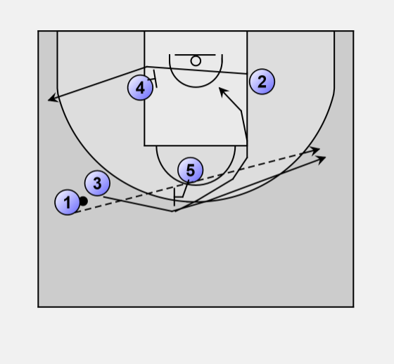 2 who has started to cut use 4 for a baseline screen. If 2 is free in the corner 1 passes to 2 for a 3-point shot.