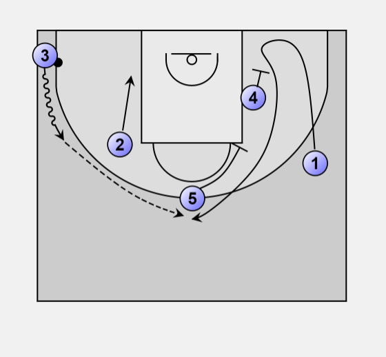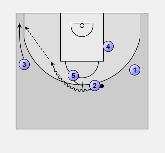 • 5 sets a ball screen for 2, who looks for 3 in the corner for the potential 3 pointer shot.