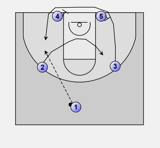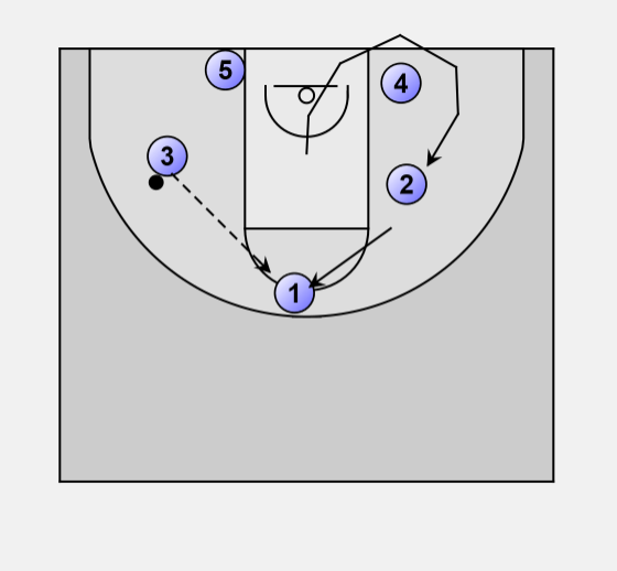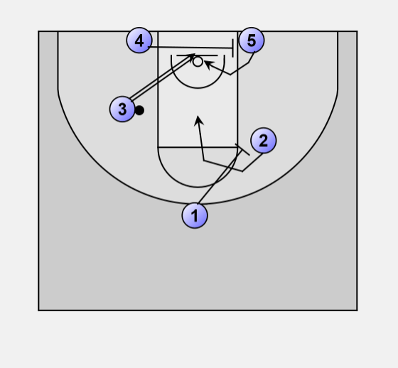 After player 1 passes the ball to player 3, player 1 moves to the left and sets a pick for player 2. Player 2 curls around the top of the pick and cuts down the lane.