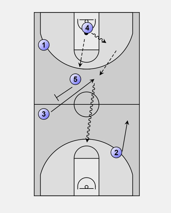 If 5 is not open, 4 takes it on the dribble, and 5 screens away to get 3, who flashes hard to the middle.