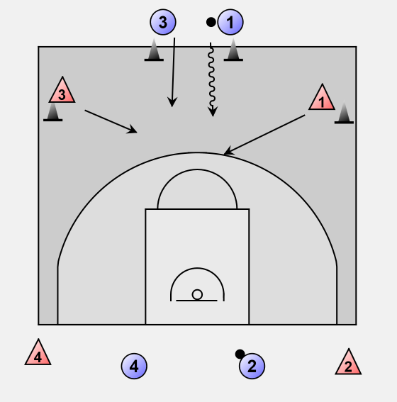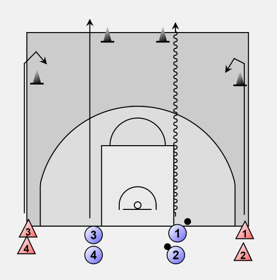 After rounding the pylons player 1 and 3 play 2 on 2 against defenders 1 and 3.