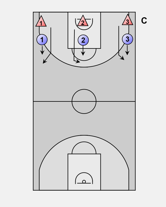 Defensive players follow and run past their partner, making a slash arm and blocking out. Roles are then reversed as the players run full court.