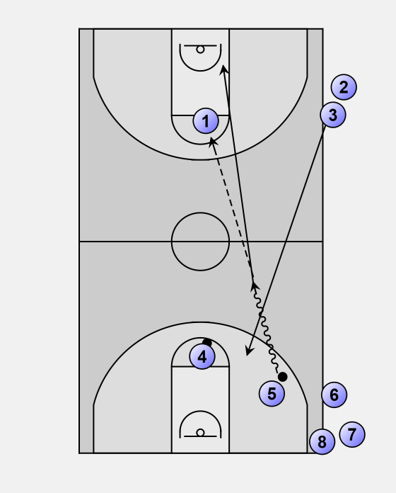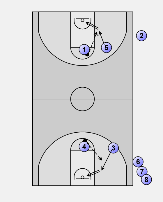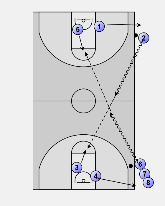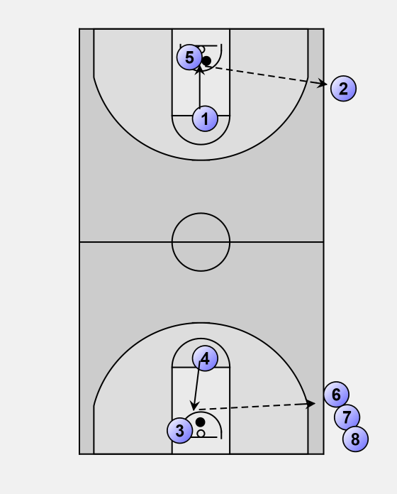 • Opposite shooter breaks for a layup on the far end at about the same time.