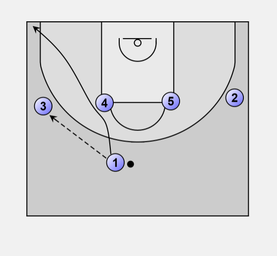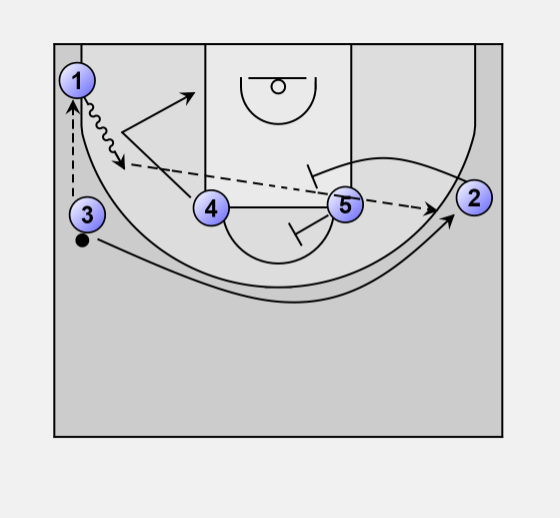 3 passes to 1 down the floor, 4 then comes out to screen on the ball as 3 cuts across the lane, to create a two man game between 1 and 4.