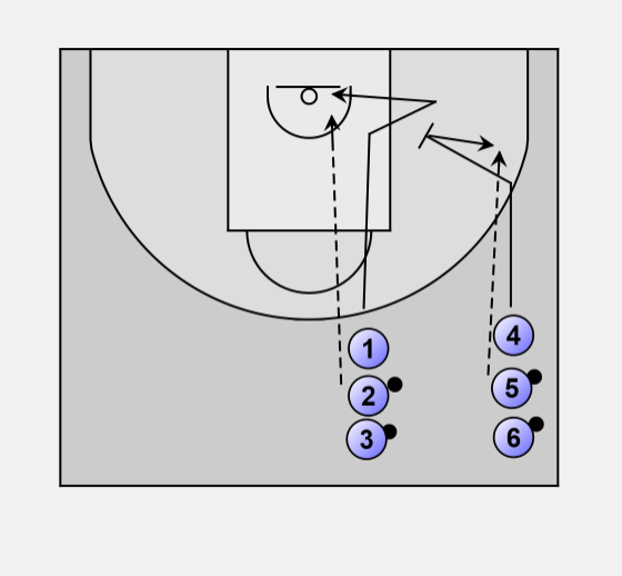 Player 1 comes fakes coming off the screen and then makes a hard back cut to the basket to receive a pass off player 2, while the screener (player 4) now pops to "space" to receives a pass off player 5.