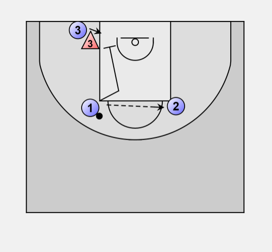 Player 1 passes to player 2 and sets a screen away from the ball for player 3.