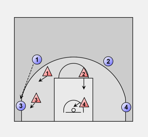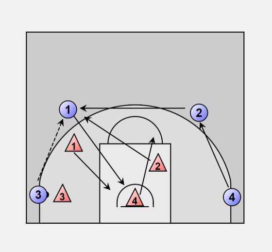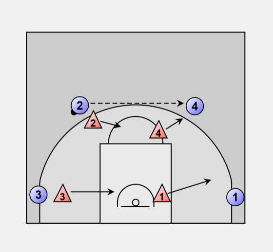 • After pass, 4 cuts to the basket, 2 replace 4 and 3 replace 2.