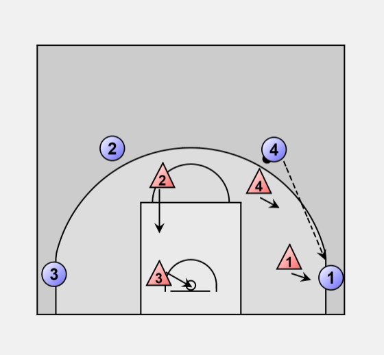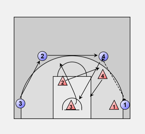 • After pass, 1 cuts to the basket, 2 replace 1 and 4 replace 2.