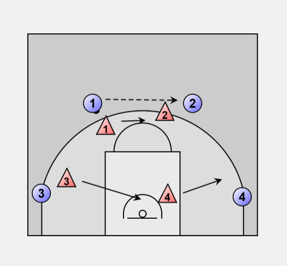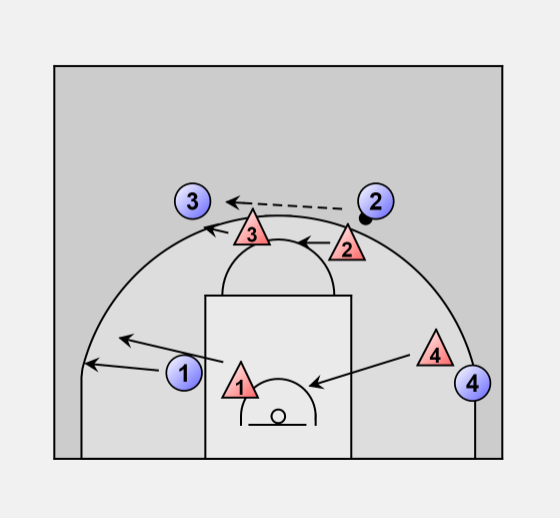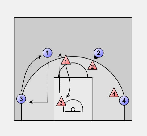 Offense 2 passes to 3 and the same sequence repeats.