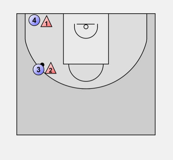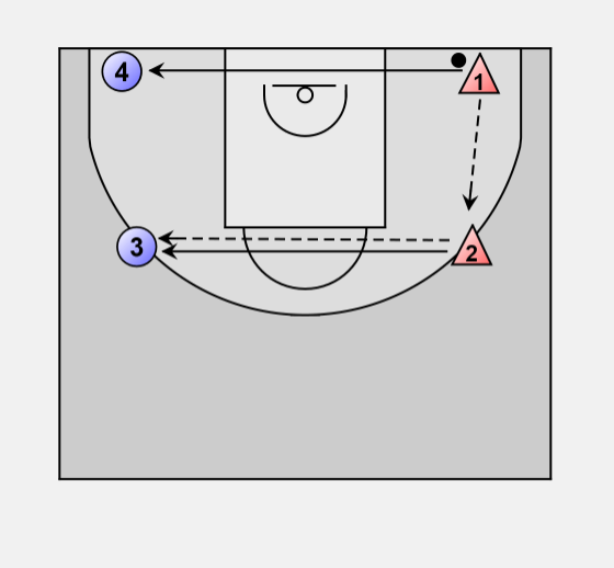 1 passes the ball to 2 and plays closeout on player 4. (First sprint, last part defensive steps)