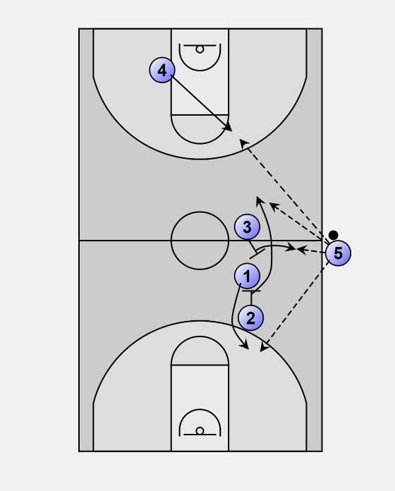 On the hit 2 screens for 1 to get open in the backcourt, then receives a screen from 3 to get open in the frontcourt.