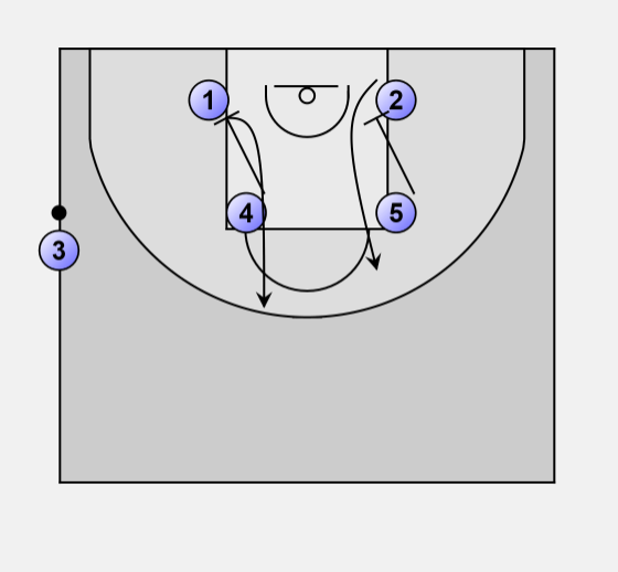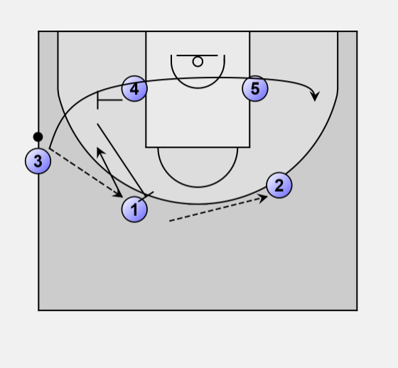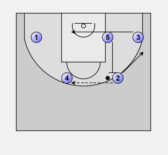 O1 pass the ball to O2 and then receives an up screen from O4.