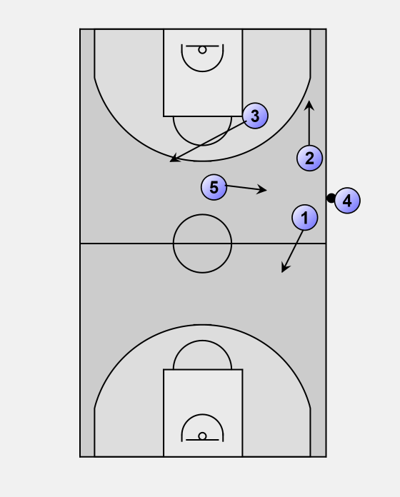 1) Sets up towards the offense basket, then flashes towards the sideline and half court line.