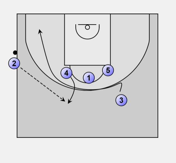Player 3 starts with a fake cut towards the base line, and then uses players 5, 1 and 4 to cut down low.