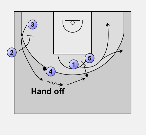 The moment 3 takes the hand off 1 uses the screen of 5 and goes either to the baseline or to the forward position for a 3-pointer.