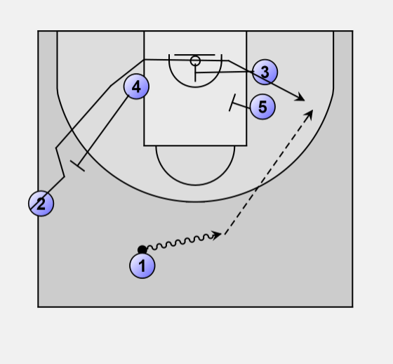 After player 1 cuts off screen, player 4 screens defender on inbounds allowing player 2 to cut, to the other side using the double screen by 3 and 5.