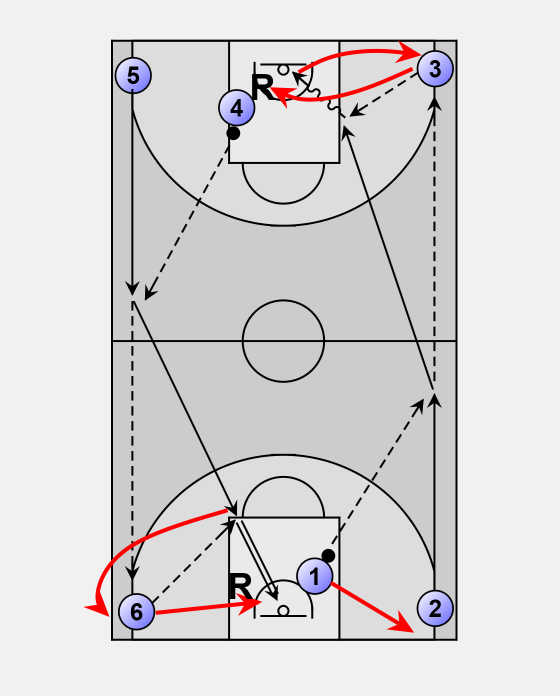 Receives the pass back from 03 and goes to the basket for lay-up.