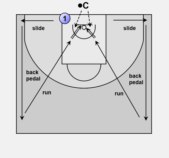 Player 1 faces the baseline and slides from the edge of the key to the sideline. They then back pedal to the 1/2 way line, stop, and then sprint to the basket to receive a pass off the coach and shot a lay-up.