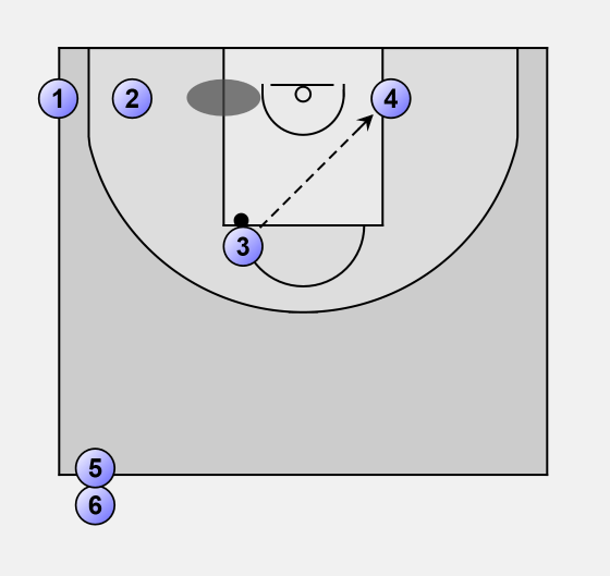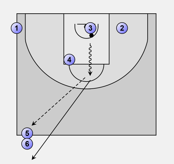 3 takes the rebound, dribbles to the free throw line and passes to 5 and follows to a position behind 6.