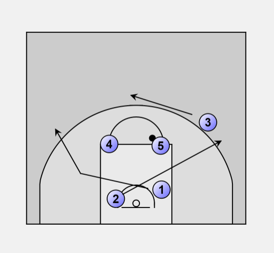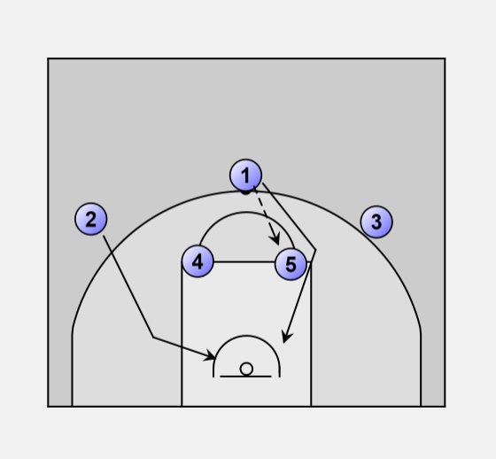 If 5 does not hand off to 1, pivots to the basket and looks to 2 for the lay-up.