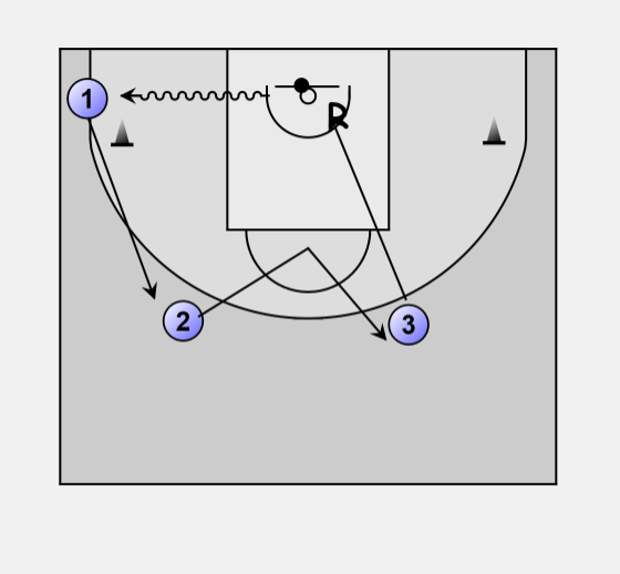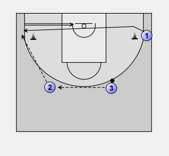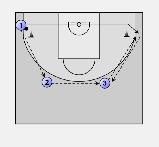 1 passes the ball to 2, and cuts to the other corner.