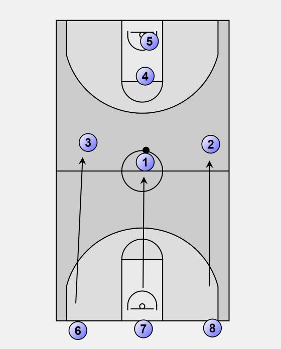 Guards dribbling at least to the foul line before passing for the layups.