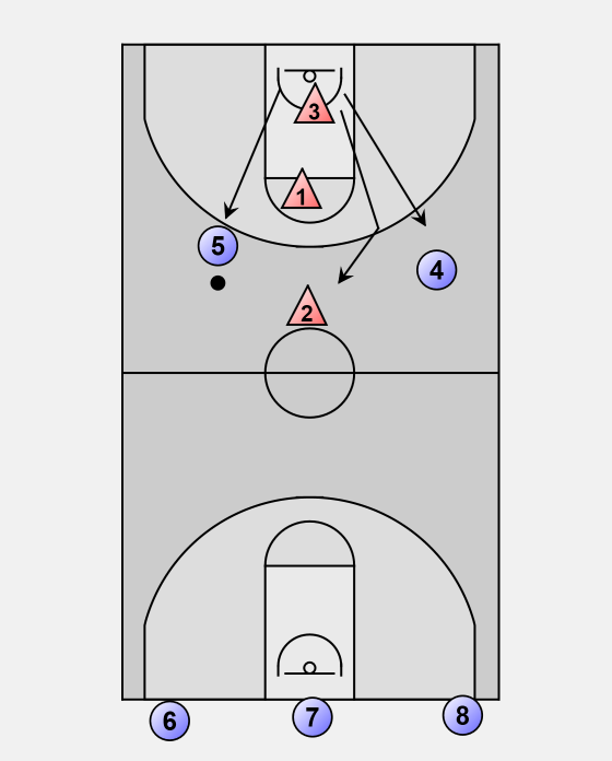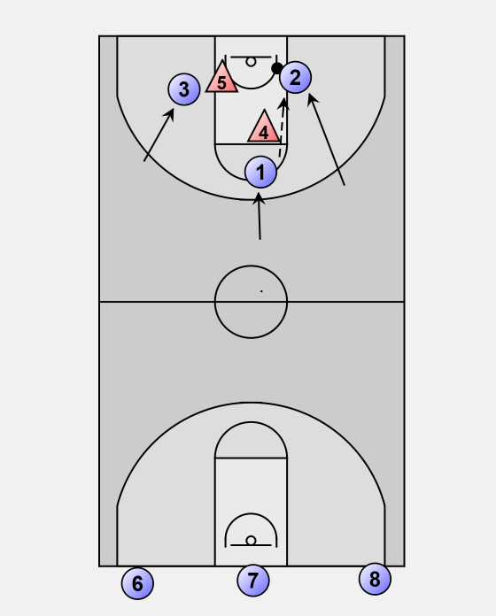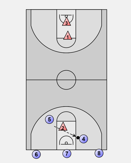 Player 5 passes to Player 4 for the layup.