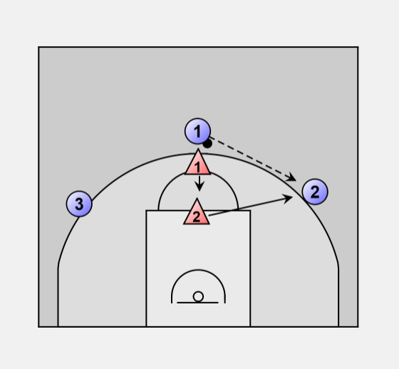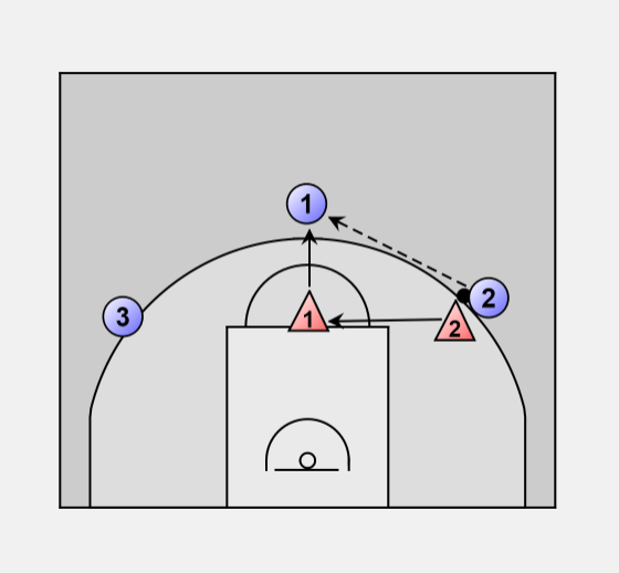 If the ball is passed back to the top, 1 sprints to the ball and 2 slides back to high post area.
