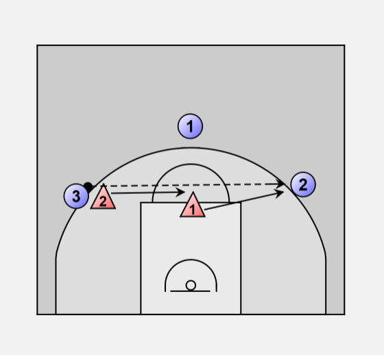 If the offense plays a skip pass, 1 sprints to the ball and 2 slides back to the circle.