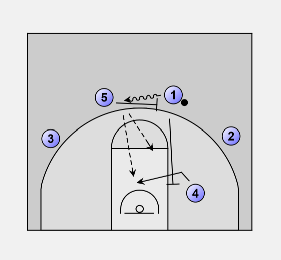 5 sets a ball screen for 1 and rolls to the basket. If he does not get the ball, he screens 4.