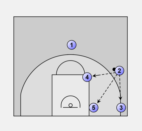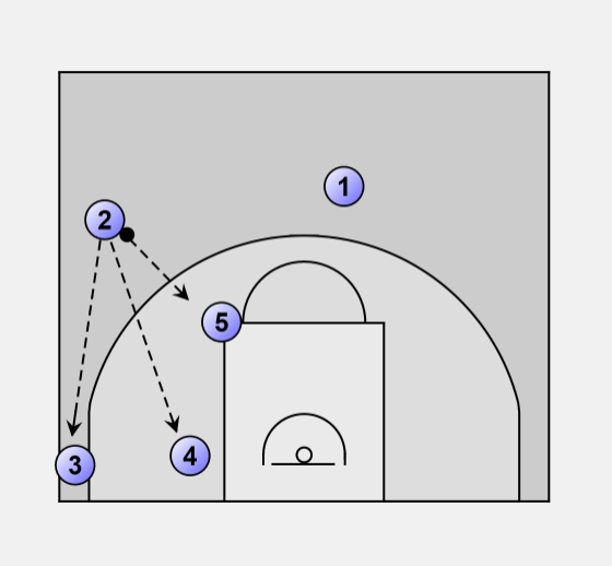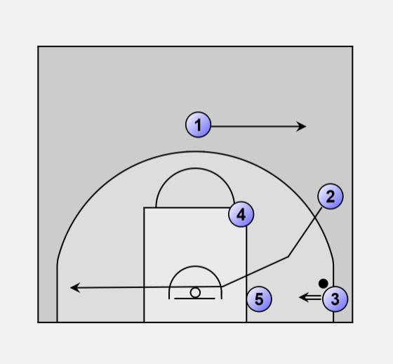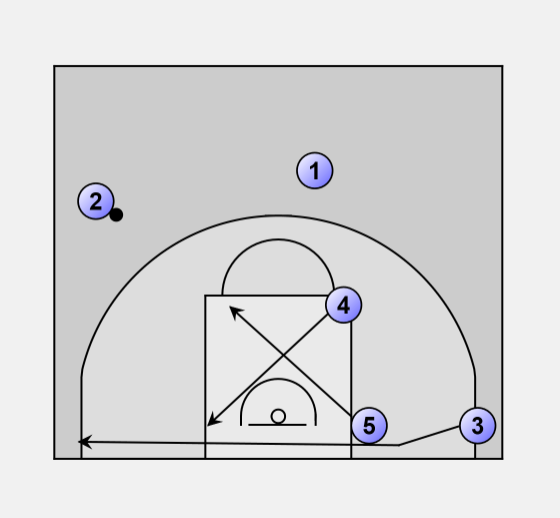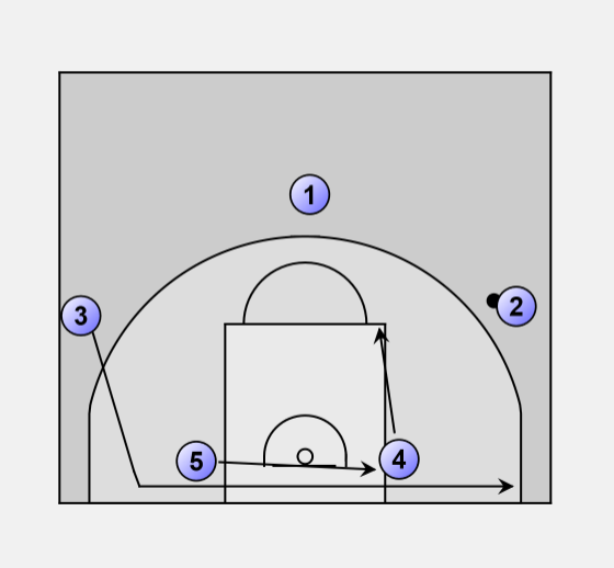 Ball-side post (4) comes up and weak-side post cuts through to the ball.