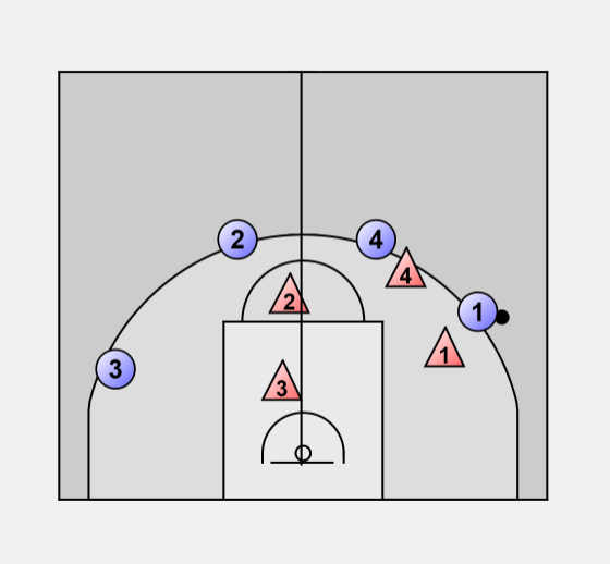 O4 starts with the ball, dribbled down from 1/2 court to the Guard Spot.