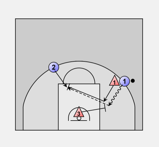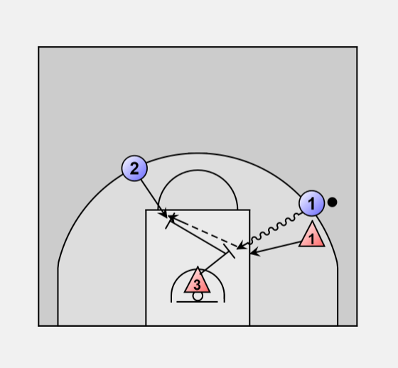 O1 also cooperates by either continuing straight at the basket trying to draw the blocking foul or pulling up directly in front of D1 for the jumper.