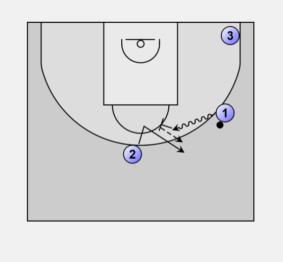 Player 1 dribbles towards player 2 and sets a screen for player 2, by doing a reverse pivot on the inside leg (leg closest to the basket).