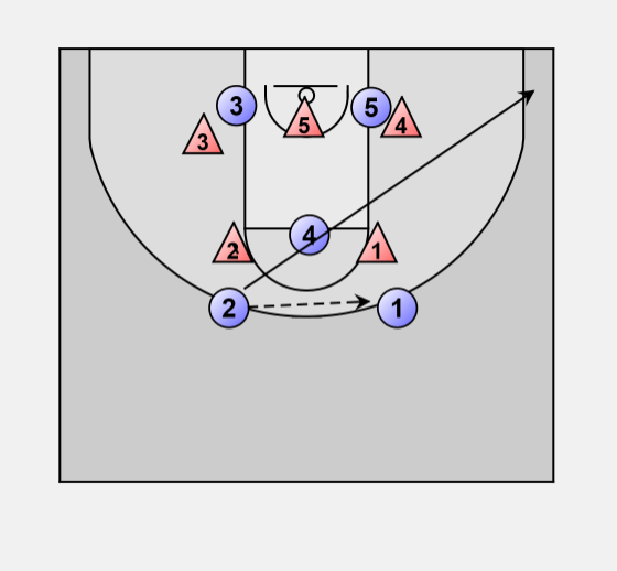 If D1 stays out on 1, then 2 has the option of passing to 5 or look to hit 4 at the high post.