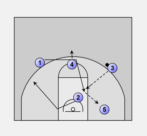 (1), if he does not receive the pass, will reverse and set a back screen for (4) cutting to the basket.