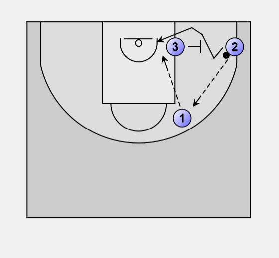 2 uses the screen of 3 and get the ball from 1 under the basket.