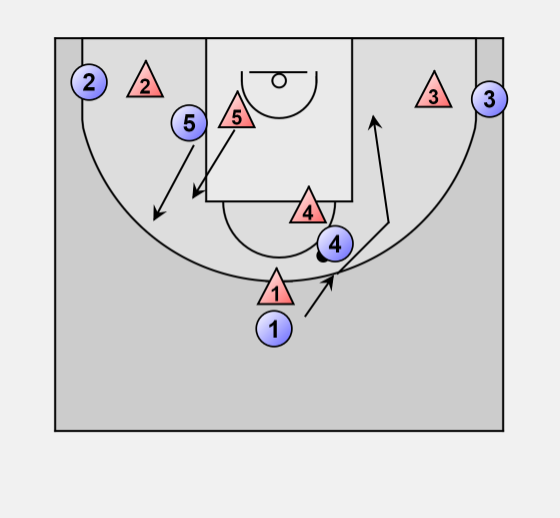 4 sets a dribble screen for 2, hand off between 4 and 2.