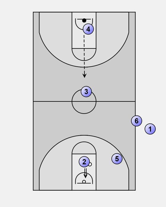 Player 4 starts his dribble to the other side of the court. (In this case with the left hand which is often the weak hand of players)