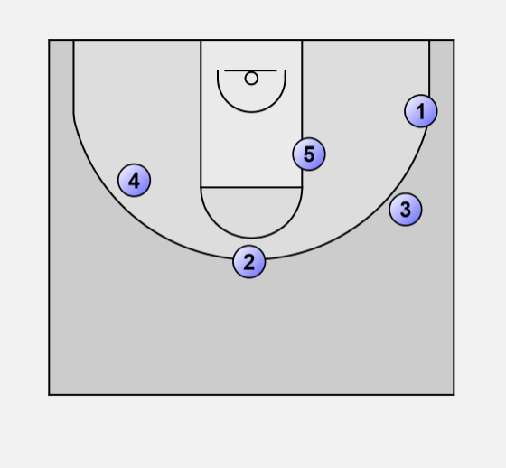 The offense begins with 4 and 5 located at the elbows and the two wing players on the lower blocks, as shown. When the point guard reaches the bottom of the mid-circle, 4 and 5 then downpick for 2 and 3 to get them open in the wing areas for a pass from 1, as shown in the diagram.